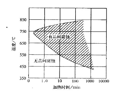 可以看出,产生晶间腐蚀倾向是在一定的温度范围内,并和加热时间有关。在某一段温度范围内会产生晶间腐蚀倾向,若加热时间短,则碳化物来不及析出,若加热时间长,则因铬的扩散使含量成分趋于均匀,这样都不会形成晶间腐蚀倾向